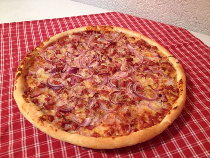 sos pomidorowy, ser, bekon, kiełbaski, cebula, oregano