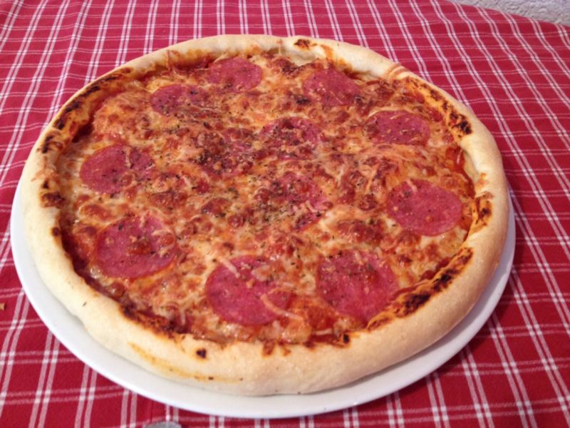 sos pomidorowy, ser, szynka, salami, pieczarki, ostra papryka pepperoni, oregano
